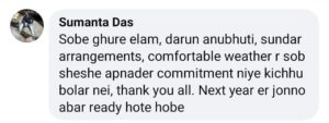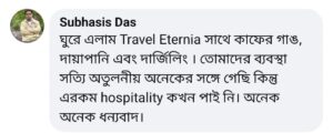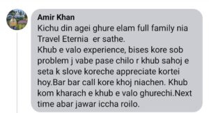 আমি ও আমার ৬ সহকর্মী গত ১৫ ই জুলাই থেকে ১৯ শে জুলাই ২০২৩ পর্যন্ত Travel Eternia ব্যবস্থাপনায় ঘুরে এলাম দার্জিলিং এর আশেপাশে বিজনবাড়ি, তাকদা, দাওয়াইপানি এবং সিটং। সবকটি জায়গায় থাকা ও খাওয়ার ব্যবস্থা ভালোই ছিল। গাড়ির ড্রাইভার রাকেশজিও খুব ভালো মানুষ। সবথেকে যেটা ভালো দিক সেটা হল Travel Eternia র Customer care থেকে প্রতিদিন দুই বেলা নিয়ম করে আমাদের খোঁজ খবর নেওয়া হয়েছে। Customer care madam (Madam এর নামটা আমার জানা হয়নি) কে এর জন্য আলাদা ভাবে ধন্যবাদ জানাই আর অভিজিৎ বাবুর ব্যবস্থাপনা এককথায় অসাধারণ। ভবিষ্যতে আবার আপনাদের সাথে বেড়াতে যাওয়ার ইচ্ছে রইল।